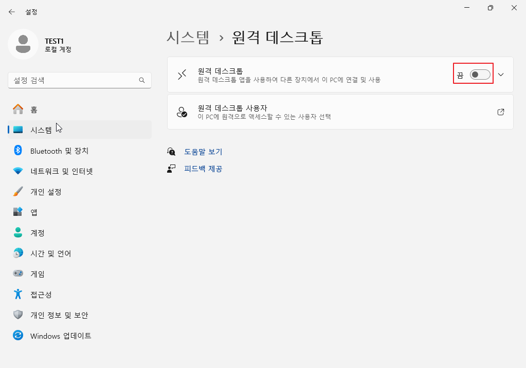 3. 원격 데스크톱은 기본적으로 꺼져 있는 상태입니다. 켬으로 변경하여 활성화해주세요