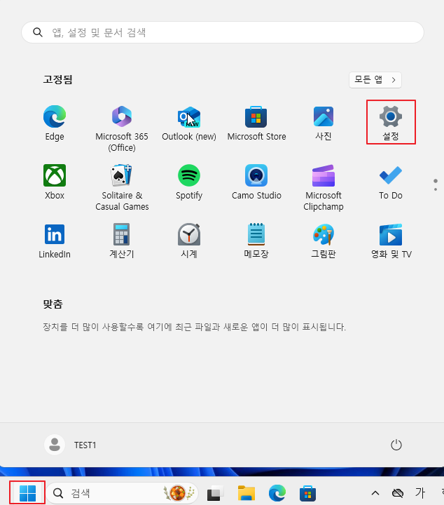 1. 원격 데스크톱 설정을 하기 위해 작업 표시줄 시작에서 설정으로 이동해주세요