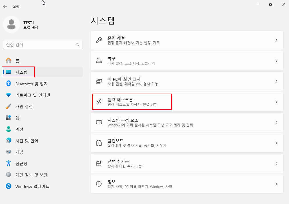 2. 왼쪽 메뉴 중 시스템으로 이동 후 조금 내려보면 원격 데스크톱이 있습니다. 원격 설정을 위해 원격 데스크톱을 클릭해주세요