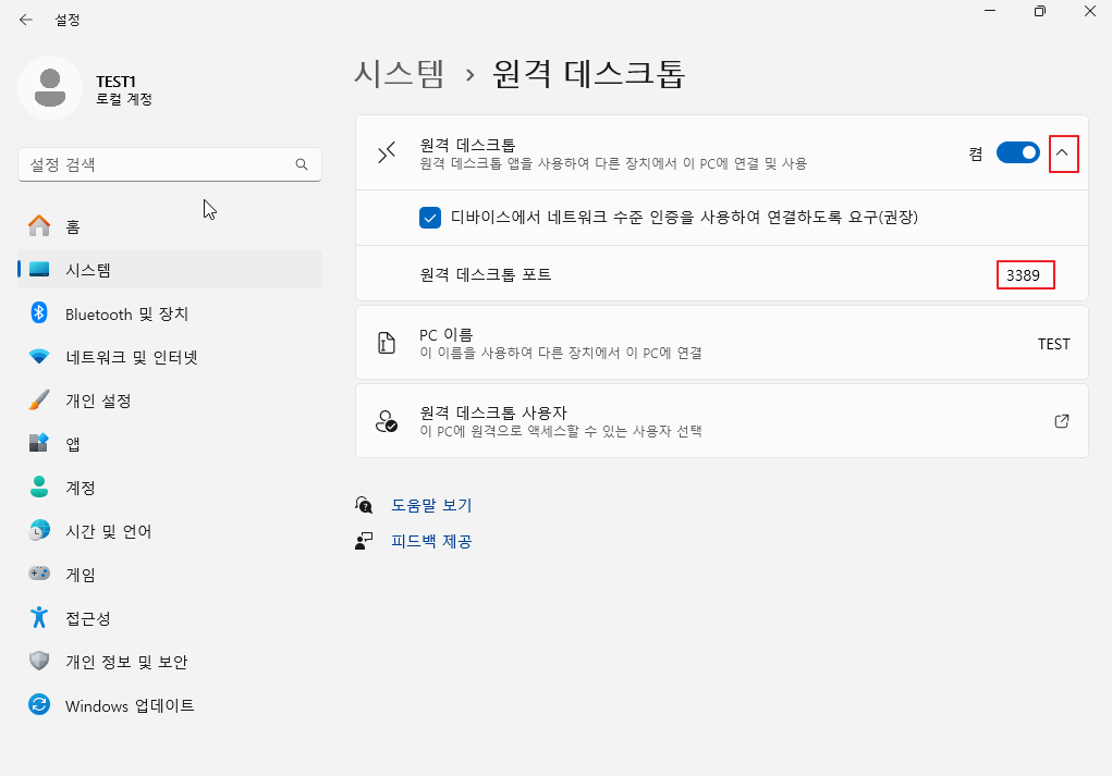 4. 원격 데스크톱 설정이 완료되었으며 원격 데스크톱을 펼쳐 보면 원격 시 사용하고 있는 포트 번호를 확인할 수 있습니다.